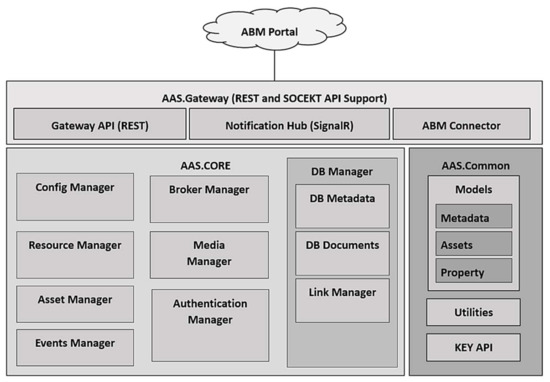 The logical architecture of the Asset Administration System (AAdSys) that manages all asset data is shown in Figure 12. AAdSys consists of several main functions, i.e., to generate assets by wrapping data into the Asset Administration Shell, to allow the query of instance data; to store instance data, to store and retrieve files or media associated with the assets, and the authentication of asset data access control. It also supports data connectivity over web transfer protocol through Web API to ensure the interoperability between the AAdSys and other components, functions, and services, such as ERP, MES, SCADA, and PEC applications.