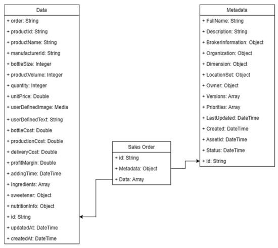 To test the data channeling between the PEC and OMIS, the “Sales Order” asset is created. The PEC application must generate instance data of the “Sales Order” asset whenever a customer places an order and then wrap the data into the AAS format, as shown in Figure 15. A sample AAS format is shown in Figure 16. The AAS is in the JSON format, i.e., the key-value pair format. It is used as a data model for storing instance data. Hence, the asset instance ID must be unique to every transaction. For the “Sales Order” asset, the order identifier (ID) is used as the instance key while the sales order data is the value, which data objects are generated. The key-value pairs are used to manage the asset instances, allowing the instance data to be queried and retrieved based on the key. This data model establishes common semantics and enables data objects to be easily channeled between the AAdSys of PEC and the AAdSys of OMIS for seamless data communication and integration.