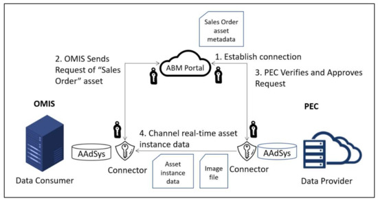 To demonstrate this concept in the POC of this use case, before any data can be channeled between OMIS and PEC, the OMIS owner must subscribe to the desired assets published by PEC, i.e., the “Sales Order” asset, with a specified date range. Upon request, the administrator of PEC has to decide whether to approve or reject the subscription. Once approved, the custom module in the AAdSys of OMIS will automatically connect to the ABM Portal to validate the request and to check for the details of the assets needed to be channeled from PEC, according to the specified date range. In order to receive the notification of the production status information from OMIS, PEC must also subscribe to the “Sales Order Status” asset that belongs to OMIS. The same approval process involved in the ABM Portal is applicable to the OMIS owner as well. For any approved request established, the requested data that are entered to the AAdSys of the Data Provider will be channeled to the AAdSys of the Data Consumer. For instance, when there is a new order created on the PEC’s application, the “Sales Order” asset data will be sent to OMIS AAdSys. The “Sales Order” asset is the sales order data wrapped in the Asset Administration Shell, a format that is accepted by AAdSys. The OMIS Connector will then receive the “Sales Order” asset data through the RESTFUL protocol. Similarly, once the OMIS manufacturing line has completed a job, the “Sales Order Status” asset will be created and channeled to the PEC, received by the PEC Connector, and then stored in the PEC AAdSys. The PEC AAdSys will then update the sales order status to the PEC Online Ordering System database.
