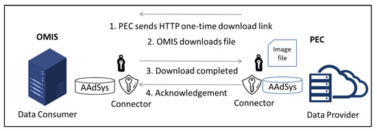 As part of the AAdSys framework, files, such as label images, are a type of media that can be transmitted to data consumers. However, due to the limitation of SignalR and the protocol for the transmission of data, there is a message limit of 32 kb. To overcome this issue for larger media file sizes, whenever the ABM Connector of PEC detects a new file has been added, it will generate an HTTP one-time download link. This link will then be sent via SignalR, and the receiving ABM Connector of OMIS can then use this link and perform an HTTP download. All processes are done seamlessly and require no input from the user. Upon downloading and saving the file, the data consumer sends a notification that it has been downloaded, and the data provider will acknowledge that the file has been sent. The file transfer activities are shown in Figure 21.
