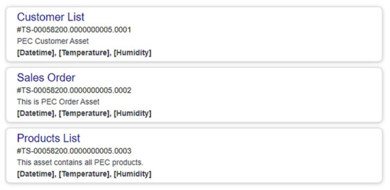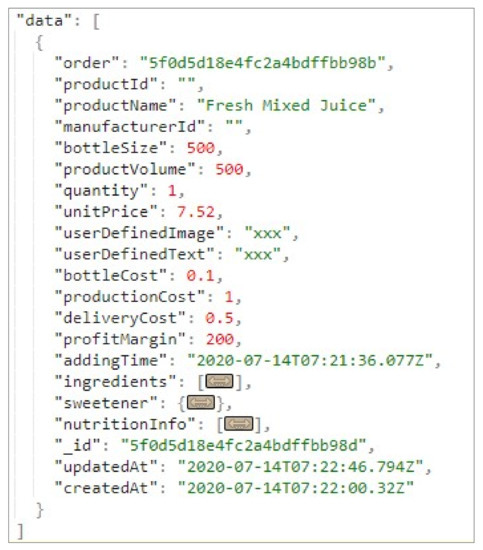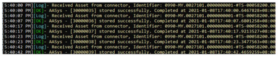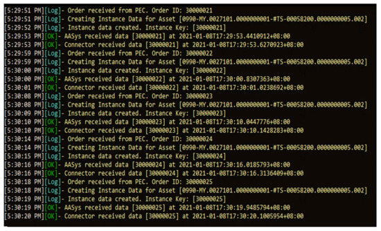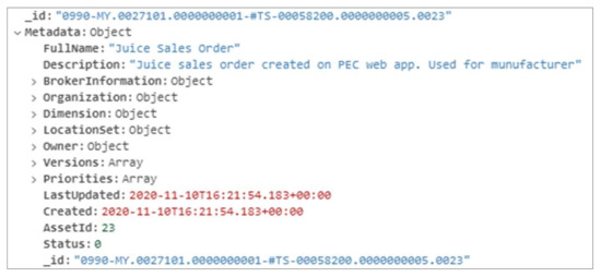 In the first test case, PEC is tested to create the “Sales Order” asset instances before the publishing of the asset to the ABM Portal, and before any data channeling between PEC and OMIS can be conducted. In the experiment, the generation of metadata of the “Sales Order” asset is successfully created; an example is shown in Figure 23. The “Sales Order” asset is maintained in the PEC AAdSys to be shared with OMIS in the next test case. A sample instance data of the “Sales Order” asset generated upon a new order by a PEC customer is shown in Figure 24. The creation of new instance data upon a new order and the data channeling event log between AAdSys and its Connector module are shown in Figure 25. Similarly, OMIS is also tested to generate the “Sales Order Status” asset. A sample of a “Sales Order Status” instance is shown in Figure 26. OMIS is the asset owner of the “Sales Order” Status asset, and PEC will be receiving it to update its web application to reflect the latest production status of the customers’ mixed-juice orders. In summary, all the necessary asset data are successfully generated based on the asset modeling design discussed in Section 4.1.