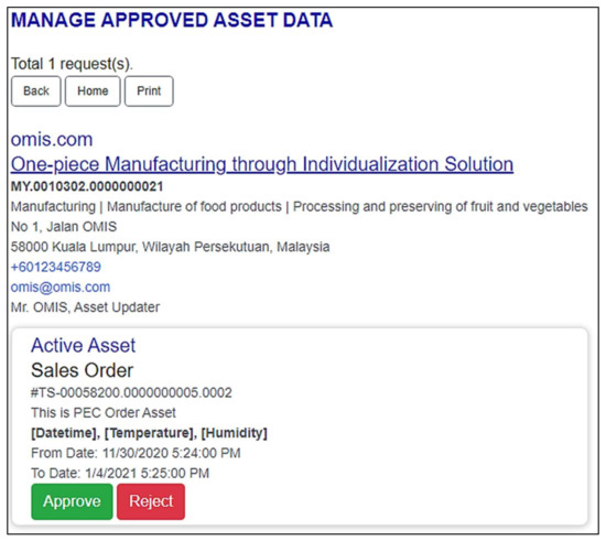 Next, the data provider must approve the request of the asset data before the asset instance data can be channeled. The ABM Portal is expected to display the list of organizations awaiting approval of their requests. As shown in Figure 29, OMIS is on the waiting list, which can be viewed by the PEC administrator, who is the data provider; now, the PEC administrator can approve or reject the request.