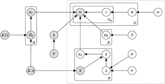 The plate diagram for Source-LDA is highlighted in Figure 2, and a similar adaption can be imagined for any semisupervised input model [26,27]. The variables in Figure 2 are explained in Table 1. Since the labeled topics are part of the generative model, the inference must consider these new variables for any semisupervised topic model. A general Gibbs sampler [42] can be built using the sampling condition given as: