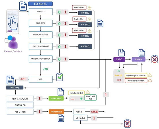 Questionnaires triggering system. The patient is sent a monthly notification to answer the EQ-5D-3L [18] questionnaire. If an alteration in any of the domains of the questionnaire is reported, the patient is automatically notified of a more specific questionnaire to which the altered domain refers: HIVSRQ [19], GAD-7 [20], PHQ9 [21]. If the EQ5D VAS is <70%, then all the above questionnaires are notified, including the treatment adherence questionnaire [22]. With regard to HIVSRQ, if symptoms compatible with SARS-CoV-2 infection are reported, the patient is asked for an in-depth investigation of COVID and risk of hospitalization (chair stress test, CST). In case of alteration to each questionnaire, a report of need for intervention is sent to the attending physician (psychological support, psychiatric support, intervention on symptoms, intervention on low adherence to ART, intervention on COVID-19 risk).