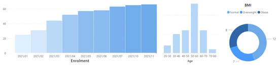 Unfortunately, the pandemic has only allowed us to recruit 61 patients at this point, since the beginning of the study in January 2021. Recruitment is still active though, with the latest patients being enrolled in November 2021 in an ongoing process. The enrolment process across time and some demographic information about the study population is given in Figure 2.