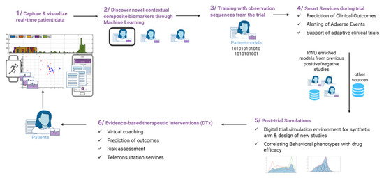 The lifecycle of RWD in Healthentia can be described in six steps. In step 1, data are captured and visualized at real-time basis. In step 2, digital composite biomarkers are discovered, and patients are clustered using ML algorithms. For this purpose, physiological, psychological, and sociological data are used. In step 3, training of the selected patient model is performed by means of observational sequences from the trial in order to allow smart services to be applied, such as prediction of clinical outcomes and alarms (see step 4). At the end of a study, the investigator can further use the derived patients’ models to run in silico trials (see step 5), while the enriched models can be utilized for digital therapeutic (DTx) services, such as the orchestration of virtual coaching messages.