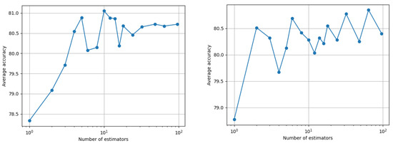 Balanced accuracy for the RF classifiers averaged over all four outcomes as a function of the number of estimators for one (left) and two months (right) memory.