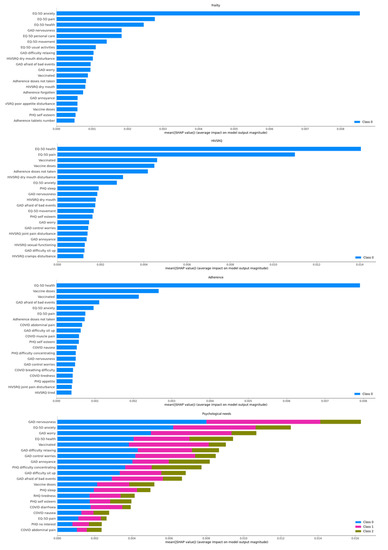 The decisions of the classifier are analyzed using Shapley Additive explanations (SHAP) analysis [28]. SHAP analysis is applied on every decision, yielding the effect of each attribute in the feature vector towards a positive or negative prediction. These attributes are questions in the different questionnaires, and thus the SHAP analysis actually yields the on average most important questions to ask for each outcome. This is shown in Figure 5.