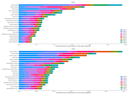Finally, the most important factors for the decisions based on one month history are compared to those based on two months in Figure 6. The attributes whose names finished with a “-1” were those of the oldest month. Note that many of the most important attributes were from the oldest month, with the current one not ranking high, such as the PHQ sleep, preference to die or lack of interest, or the GAD ability to control worries or to sit up. On the other hand, in some cases, the attributes of the two months of history appeared in pairs, such as the most important pair of EQ_5D health of the previous and this month or the EQ_5D pain.