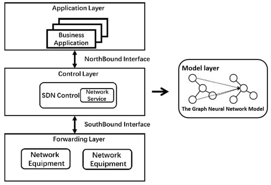 As a new network architecture, SDN realizes the separation of the control plane and forwarding. Through the open South interface, the SDN controller realizes the centralized control of the underlying forwarding equipment [21]; various network applications can make the network interface software open and programmable through the open North programmable interface, which greatly improves the flexibility of network deployment and service deployment [22]. SDN divides the network into three parts: application layer, control layer and forwarding layer. The control layer is responsible for the generation and distribution of all forwarding logic. The author of [23] presented a machine learning powered SDN work. Therefore, this paper implements the model layer on the control plane of the software defined network. Figure 1 shows the basic architecture of SDN, in which the graph neural network model proposed in this paper is located in the control plane. The application layer controls the forwarding rules of flows in the network through the programmable interface provided by the control layer, while the infrastructure layer is responsible for carrying specific services [24].