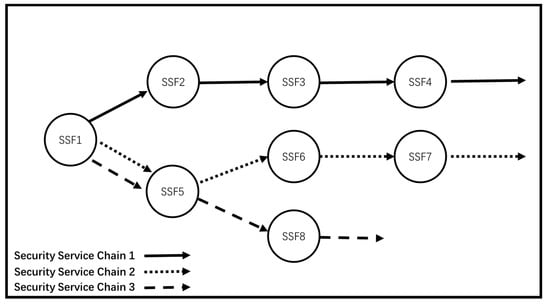 The service function chain is a collection of ordered service functions. It formulates different service function paths to process data according to policies. Based on the service function chain, the security service function chain (SSFC) is mainly responsible for the security service function and the specific processing of the received messages, such as the firewall, IDS, IPS and other security devices [31]. It is a security service function and defines an orderly set of virtual security functions.