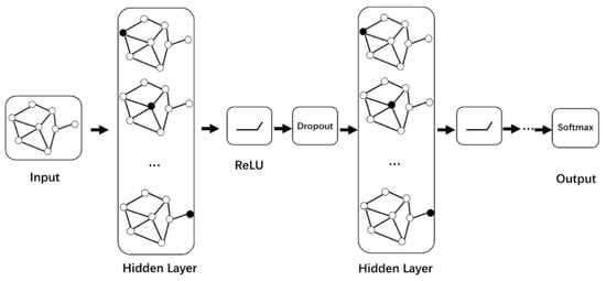 Then we carry out iterative calculation in the graph neural network. We use the Relu activation function and dropout to alleviate the problems of gradient disappearance and overfitting in the iterative calculation of each layer in the process of learning the characteristics of link nodes in the graph neural network. Finally, the softmax function is used as the activation function to obtain the prediction node corresponding to the maximum probability in the probability matrix and construct the security service function chain. The graph neural network model is shown in Figure 6.