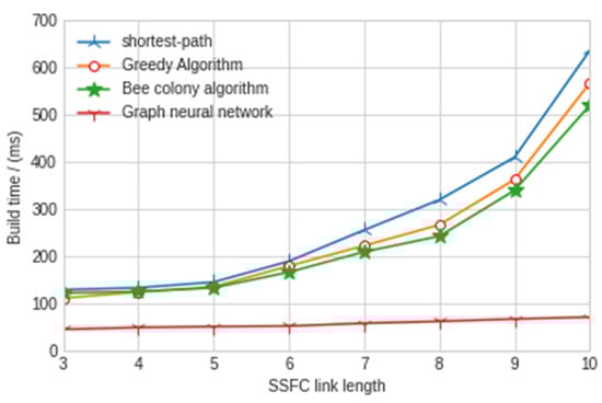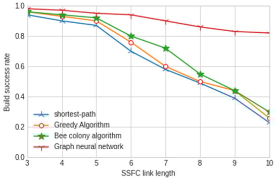 This section mainly introduces the experimental results of using graph neural network to construct the security service function chain, and compares our proposed method with the construction methods in recent years: greedy algorithm, shortest path algorithm, bee colony algorithm and other related traditional algorithms. The proposed model is compared with them in terms of the network delay, throughput, construction time and success rate of the security service function chain.