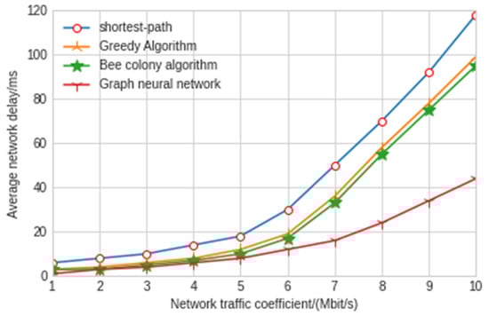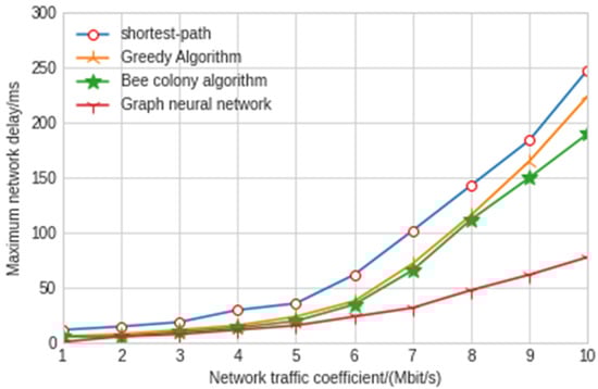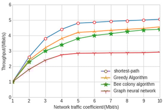 The experimental results show that the shortest path algorithm is the worst in terms of throughput and network delay. The maximum delay and average delay of the graph neural network model in this paper are 77 ms and 43 ms, respectively, which is nearly twice shorter than the other three artificial intelligence algorithms. As can be seen from Figure 11, the throughput of the model experiment in this paper is 2.97 Mbit/s, which is also far lower than the other three algorithms. The greedy algorithm and hybrid bee colony algorithm can achieve relatively close results. Because the greedy algorithm uses local information when making an action decision, the greedy algorithm has slightly greater jitter than the bee colony algorithm. The results also show that the graph neural network algorithm improves a lot compared with the other three algorithms, and the delay and throughput are far better than the other three algorithms. Moreover, in the network security environment with high delay requirements, the delay of control signaling in the SDN controller and switch cannot be ignored. At this time, the graph neural network algorithm has very significant advantages. With the increase in traffic intensity, the performance of the graph neural network is better and more stable. The graph neural network algorithm can make decisions with less observation information after training through the surrounding node information, which reduces the interaction delay with the controller. In addition, when the SDN controller fails, the graph neural network algorithm can also maintain good results.