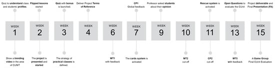 Gamification is the use of “game-based mechanics, aesthetics and game thinking to engage people, motivate action, promote learning, and solve problems” according to Kapp et al. []. The use of gamification in learning environments can positively impact the learning outcome []. It is being used to motivate students to realise specific tasks and improve their motivation and concentration []. In this case, the use of a narrative is essential to measure the engagement and impact of gamification activities [].