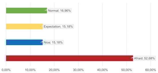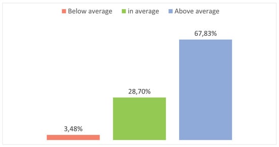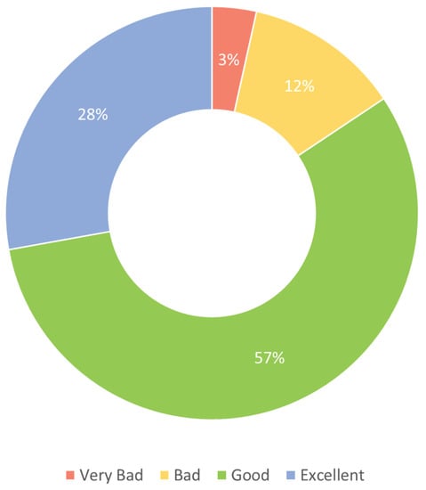The students’ opinions were very positive and motivated a global and compelling analysis. More than ninety-five per cent of students (96.53%) considered this CUnit to be the average or higher than the average of other online subjects, and ninety per cent of students considered ioEduc valuable. Most of the students (60%) liked online lessons, but 40% answered negatively. It is an excellent point to notice that this result was below what was initially indicated by the students (Figure 6). The negative answer was justified by the working conditions (e.g., one computer at home to many users/students or lousy internet). The quality report of the University of Minho attested to the answers provided by the students through the university’s own assessment mechanisms. All the topics, including pedagogical dimension, working conditions, professors performance, and student motivation, achieved more than ninety per cent of positive answers. As mentioned before, TechTeach has the primary goal of motivating students. Thus, and as can be observed in Figure 17, almost 80% of students had good or excellent motivation, and less than 5% did not feel motivated to participate in classes. These results prove the effectiveness of this approach.