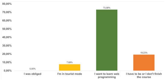 It is a natural process of human development []. This process can be divided into two types: technical and soft. The first type is concerned with all technical and professional knowledge that a human can learn. Soft-skills represents human actions, behaviour, and beliefs. Adapting and optimising skills is demanded in the modern world []. Regarding the educational field, this process elevates the cognitive and constructionist pedagogical perspectives []. This case study trained the students in two types of skills: technical (web programming and similar) and soft (argumentation, adaptability, leadership, resilience, communication, entrepreneurship, innovation, among others).