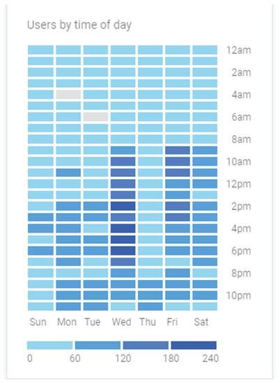 This case study also measured the students’ online activity (presence). A curious fact is that only two periods did not have anyone online—Monday from 4 a.m. to 5 a.m. and Tuesday from 5 a.m. to 6 a.m. In the other periods, at least one user was online, with class hours on Wednesday and Friday having the most.