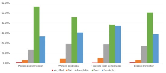 Figure 17 shows the results collected from 135 answers. This survey analysed four dimensions: pedagogical dimension (TechTeach Paradigm), working conditions (online classes and tools), teacher performance, and student motivation. All the aspects studied achieved more than 90% of positive answers. These results sustain internal evaluations, clearly show the strategy’s success, and give the confidence to continue this work in the future.