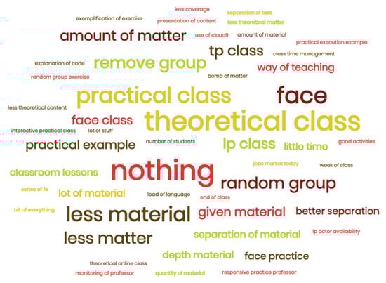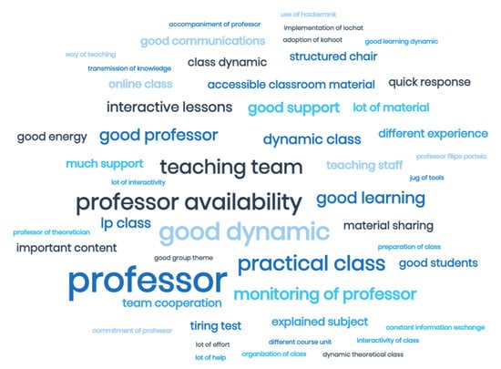 The word cloud showed a global image of how TechTeach worked in the online environment and the students’ opinions. It positively highlights the importance of professors, and, on the negative side, it has a high number of matters addressed in theoretical classes.