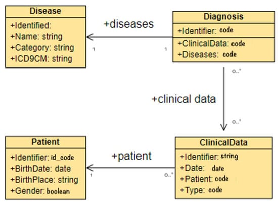 The first set of tests analyzed the extraction module of the platform, with the purpose of demonstrating that the proposed architecture is able to extract and tag the information required by the transformation module. The experiments proved that it was possible to obtain information related to diseases from the unstructured parts of EHRs, such as the disease name, its category, and the corresponding category code, or the ICD-9 CM code used to classify diagnoses. Moreover, the tests allowed the extraction of the data associated with the diagnoses and the extraction of the clinical and patient’s data, such as date of birth, place of birth, gender, etc. In Figure 3, the Entity-Relationship (E-R) diagram of a sample of the extracted information is depicted.