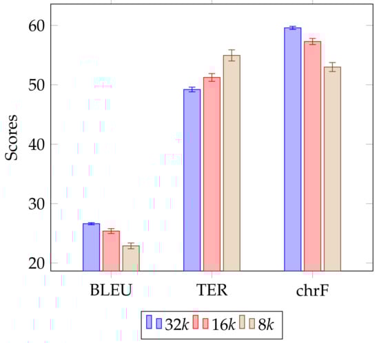 The performance of all our models was measured with three evaluation metrics, namely BLEU [20], TER [21] and chrF https://github.com/m-popovic/chrF (accessed on 2 December 2021) [22], using the MultEval toolkit [23] https://github.com/jhclark/multeval (accessed on 2 December 2021). Of course, these metrics provide an indication of the quality of the translations produced by our NMT systems, but do not provide insight into the efficiency of our systems in terms of model size, number of parameters and training times.