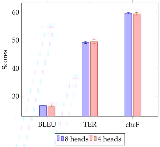 Interestingly, the model with the best accuracy was trained on the EuroParl+KD training set using 2 GPUs and only 4 Transformer heads. In some cases the student models with 4 Transformer heads were slightly quicker to train and more accurate than the original student models with 8 Transformer heads. Figure 4 shows that the accuracy is on average very similar when using the different number of Transformer heads during training, but the average training time for models trained using only 4 Transformer heads is 7 h less than when using 8 Transformer heads.