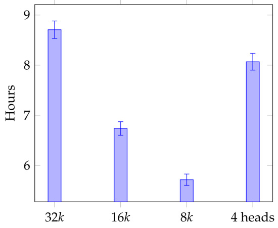 In terms of the training times for the baseline models compared to the teacher models, the scores improve marginally, but the training times are longer than those of the baseline models. In fact, the best scores are obtained with Teacher-4GPU. Figure 5 shows the average training time for the various student models and it is clear that the models with smaller vocabularies ( and ) trained faster on average, albeit with lower quality in terms of runtime performance as we have just seen. In comparison, the models with 4 Transformer heads (and a vocabulary size of ) trained slightly faster than the original student models, and with no significant deterioration in quality.
