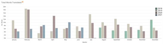 Table 10 shows the time (in seconds) it took for our models to translate the test set we used for evaluation, as described in Section 2. Figure 6 shows some of the site statistics available on the KantanMT Platform https://www.kantanmt.com/ (accessed on 2 December 2021). It is clear from Table 10 that the student models translate the source sentences much faster than the teacher models. Somewhat more interestingly, we observe that using 2 GPUs for translation yields the fastest translation time; more specifically, model Student-KD+EP-2GPU takes 29.49 s to translate 3000 sentences. Furthermore, there are 69,543 German words in the test file that was translated, so model Student-KD+EP-2GPU translated on average 2358 words per second.