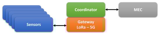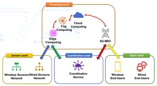This level groups three types of data processing (Edge, Fog and Cloud) with increasing capacities and latency from sensors to cloud. Edge Computing is achieved on microcontrollers, while Fog computing gathers network elements located between the edge of the network and the cloud where the most important capacities are available. The cloud offers possibilities to manage important amount of data but is limited in terms of latency, costly in terms of bandwidth due to data transfer. By opposition the Edge Computing offers very limited capacities of treatment close of sensors with reduced latency and a better level of privacy protection. The Fog Computing is an intermediate between Cloud Computing and Edge Computing with intermediate capacities of processing and storage allowing more important treatments than at the edge of the network [1]. MEC allows us to deploy services for mobile networks (Wi-Fi or 3GPP) [28]. It is obvious that these three levels of processing are brought to collaborate according to different modalities conditioned by the use cases such as cloud–edge, fog–edge, or cloud–fog–edge [29].