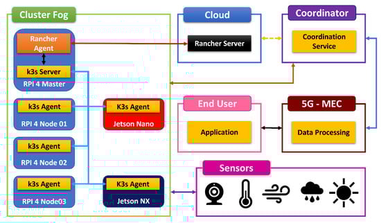 The mini-cluster is composed of two Jetson NX equipped of 500 Gb SSD Samsung 980 Pro, and four Raspberry Pi 4 8GB equipped of 500 Gb Crucial MX500 SSDs interconnected by a 8 Port Gigabit Ethernet Network switch (See Figure 5). Raspberry PI 4 runs an adapted release of Ubuntu while Jetson runs Jetpack SDK 4.6 (https://developer.nvidia.com/embedded/jetpack, accessed on 25 January 2022). k3s has been used as lightweight container manager compatible with Kubernetes (k8s). It was preferred to other solutions such as micro k8s and k8s for its low memory footprint [31], its security level using centralized Role Based Access Control (RBAC), and finally for its CUDA support. One Raspberry Pi plays the role of master node, while three others are worker nodes. Jetson nodes (NX & Nano) are also worker nodes. k3s has been deployed on the mini cluster by means of Rancher 2.5 (https://rancher.com/, accessed on 25 January 2022), an open source software with zero vendor lock-in.
