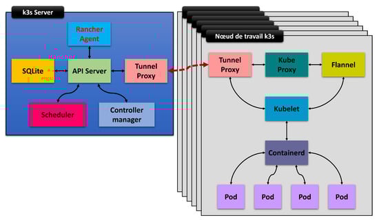 Among container orchestration systems, Kubernetes is the benchmark. Kubernetes was developed specifically for the deployment of clusters of several thousand nodes to form private, public or hybrid clouds. Micro Kubernetes (micro k8s) is a lightweight open source container orchestration platform that manages workloads (worflow) and containerized services at the edge with the ability to manage Nvidia GPU containers. Kubernetes and Micro Kubernetes are designed to work together and be deployed at the cloud and edge, respectively. Both use the notion of "pods" which are deployment units containing one or more containers. k3s is a lightweight version of k8s specifically designed for IoT as a project of the Cloud Native Computing Foundation. It takes the form of a 40 MB binary, requiring only 512 MB of memory and is adapted to run on ARMv7 and ARM64. k3s and micro k8s can run on Raspberry Pi, Nvidia Jetson Nx and Nano in theory. In practice, micro k8s has a large memory footprint for nodes with a small amount of memory, so we preferred k3s, which offers, in addition to its lightness, a sufficient level of security to implement an Edge-level cluster on constrained devices. Basically, k3s differs from k8s by replacing etcd (https://etcd.io, accessed on 24 January 2022) database with SQLite at the master node, adding a tunnel proxy that secures the connection between the master node and each worker node, and replacing the Container Network Interface (CNI) with a lighter component called “flannel”. The Figure 2 gives an overview of the interactions between software components.
