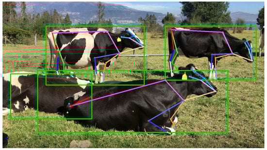 The model based on a top-down approach and using YOLOv3 (https://pjreddie.com/darknet/yolo/, accessed on 23 January 2022) as object detection models to calculate a bounding box around each animal. Afterwards, the model computes for each one a digital twin based on a skeleton made of 20 key points by means of mmPose 0.21 [32], an open-source toolbox for pose estimation. The model was trained with the Animal Pose Dataset proposed by Cao et al. [33] providing animal pose annotations of 20 key points: Two eyes, Throat, Nose, Withers, Two Earbases, Tailbase, Four Elbows, Four Knees, and Four Paws for five categories: dog, cat, cow, horse, sheep. Finally, skeletons are classified animal behaviors: standing, rumination, grazing, walking, and lying [34,35]. Images are analyzed at a rate of 0.5 frame by second at Fog Level.