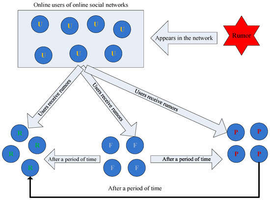 In a closed and uniform online social network with N independent individuals, nodes represent independent individuals, and edges represent social connections among users in the online network. Then, an undirected graph G = (V, E) is established to represent the whole online social network platform. Assuming that rumors spread through direct contact between disseminators and others, the rumor-spreading process in the dynamic rumor-spreading model UFPR is as shown in Figure 1.