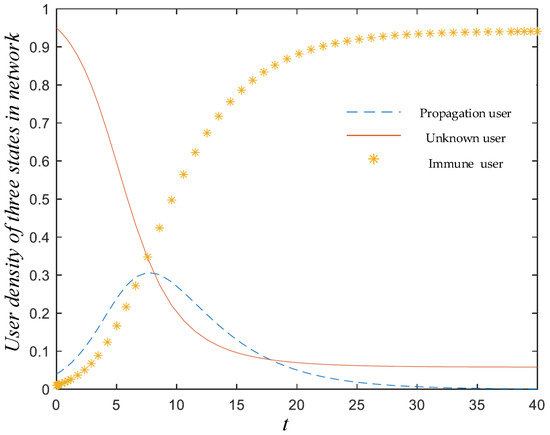 In this study, we implemented all simulation and function images on MATLAB (R2017b) 64-bit software (MathWorks, Natick, MA, USA). In addition, we conducted the related experiments on an Intel® Core™ i7-7500U processor (Santa Clara, CA, USA) with 2.90 GHz and a Windows 10 system (Microsoft, Redmond, WA, USA) with 8 GB of memory. In the modeling and simulation of user propagation state change density in the network, we used Facebook data sets with an average node degree of 29.2944, 5,284,457 user nodes, and an average of 77,402,652 connected edges.