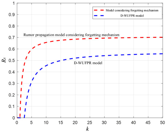 As shown in Figure 10, with the increase in the average node degree of users in social networks, the final spread range of rumors gradually increases, and it finally reaches a stable value, approaching 0.52. In the SIHR complex network rumor propagation model considering the forgetting mechanism with the increase in the average node degree of users in the network, the final spread range of rumors gradually increases, and it reaches a stable value, approaching 0.7. We observed that the final spread range of rumors in the proposed D-WUFPR model is smaller than that established by the rumor-spread model considering the forgetting mechanism, which shows that the proposed model can be used to more effectively control the final spread range of rumors. In this group of experiments, we compared the proposed D-WUFPR rumor propagation model with the existing SIHR rumor propagation model, which propagates on uniform networks and considers the influence and authority of user nodes. To prove the necessity of proposing a new rumor propagation model based on user weights, we compared the rumor propagation range in the network with the increase in the average user nodes in the network when the two rumor propagation models simulate the spread of rumors.