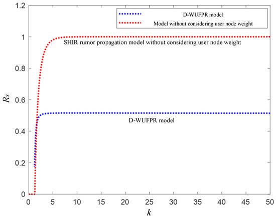 In Figure 4, we present a variation of the rumor propagation range with the average node degree of users under different propagation rates, where the horizontal axis k represents the user average node degree, and the ordinate axis Rs represents the range of rumors spreading on the Internet. Figure 4 shows that the final spread range of rumors in complex networks in the D-WUFPR rumor spread model proposed in this paper is closely related to the rumor spread rate λ. The larger the spread rate λ, the larger the final spread range of rumors in the networks.
