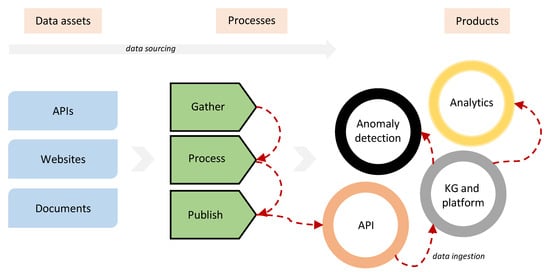 Partly in the context of the work presented here, OpenOpps (https://openopps.com (accessed on 19 February 2022)), the largest data source of European tenders and contracts in the world, sourced core TED data as well as thousands of daily notices from local, regional, and national portals around the EU. The data include details on buyers, suppliers (for contracts), titles, descriptions, values, and categories. The number of data sources is more than 680 globally and over 560 for Europe—see Table 1. Over 400 different scripts were used to gather data from each source by performing Web scraping. These scripts are deployed on a monitored platform and triggered on a daily basis to collect all documents published in the last twenty-four hours. The platform checks the status of scripts against failures and sources against potential changes (e.g., published fewer than expected documents). All scripts are maintained regularly, establishing a consistent flow of high-quality data. As data are gathered, it is stored in a raw form, formatted and cleansed, and then mapped to the OCDS. Mapping involves reallocating a source field to an equivalent field that is defined in OCDS. Data are processed as needed, such as by splitting single records into two fields, so as to comply with the data standard. This mapping process allows publishing data in a consistent format regardless of the format used by the source provider. The data sourcing process is depicted in Figure 1 in relation to KG, platform, and related products.