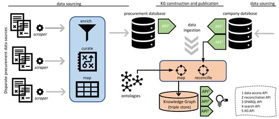 The KG construction process follows an ontology-based extract-transform-load (ETL) approach [] and mainly includes gathering procurement and company data, integrating them by reconciling entities (i.e., over suppliers), mapping them to standard vocabularies given by a set of ontologies, and transforming data with respect to these mappings—see Figure 2. In the context of this work, the procurement data set, described earlier, was integrated with a company data set during the KG construction process. This is because supplier (i.e., company) information appearing in procurement documents contains very little information and extending these data with detailed company information enables more advanced analytics processes. Company data were provided by OpenCorporates. It gathers data from national company registers and other sources through various techniques including scraping and represents data using its own internal data model. OpenCorporates has the largest open database of core company data (i.e., existence and basic attributes) in the world.