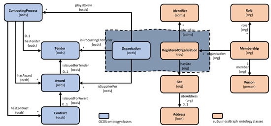 The fragments of OCDS and euBusinessGraph ontologies for representing procurement and company data, respectively.