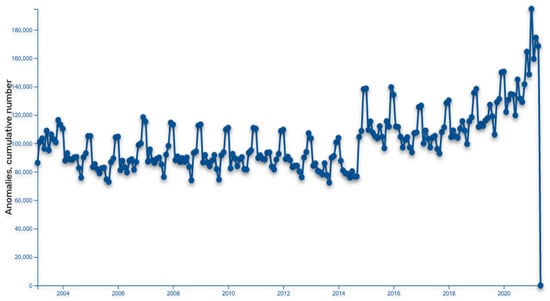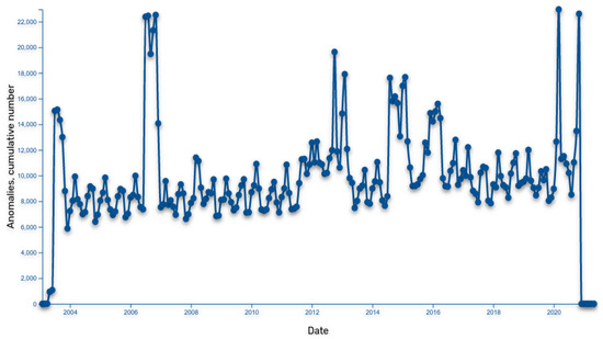 In Figure 4 and Figure 5, we present two representative examples. The first case shown in Figure 4 presents an analysis of all Slovenian public spending data with Periods method, which detected some interesting patterns in public spending changes. The x-axes represent time and starts at January 2003, where one unit means one month. The y-axis represents the number of detected extremes with start/end of the transaction period. We can visually observe several patterns, for instance, the accumulation of anomalies at the beginning of the budget year and also around local and parliamentary elections. However, there are some other extremes visible. At the end of 2006, Slovenia adopted the Euro currency, between 2012 and 2013, there were political and economic crises in Slovenia, and at the end of 2014, a new government was elected. In 2016, Slovenia expected a migrant crisis and we can also observe the accumulation of anomalies during the COVID-19 epidemic. The second example shown in Figure 5 represents the analysis of all Slovenian public spending data with the derivatives method. The x-axes represent time and starts with January 2003, where one unit means one month. The y-axis represents the number of detected “cases”, and the number of anomalous transaction extremes. There are two interesting observations. First, the graph has a global minimum around the summer of 2014, when Slovenia finally overcame the economic crisis. This can be explained as a consequence of government savings programmes. Second, specific extremes are associated to end of a budget year. Further analysis has shown the association with other specific events, such as big floods in Slovenia at the end of 2010 and 2012 and also national and local elections.