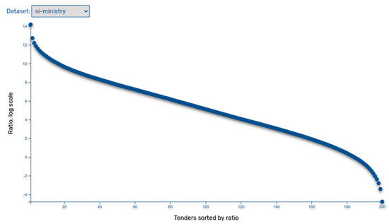 We also applied several approaches for analysing procurement data including supervised, unsupervised, and statistical analysis [,]. Concerning unsupervised learning, we clustered data using the k-Means method in order to find patterns in the data and to identify anomalous data points that are not part of the previously found clusters. For supervised learning, we used the decision tree method to acquire a better understanding of the decision-making process in the public procurement domain. Finally, for statistical analysis, we dealt with various ratios between preselected parameters, such as the ratio between tender values and the estimated number of bidders.