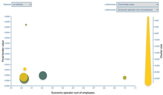 In Figure 6, a visual presentation of the interdependence of tender value and the number of employees of a bidder, as part of statistical analysis, is shown. The upper left part of the graph shows companies with a high number of employees that won small tenders, while on the bottom right part, it shows companies with a small number of employees that won big tenders. We have found several examples of companies with no or only a small number of employees who won very big tenders. Most of them were subsidiaries of foreign companies, but we have also found cases where media have been reporting about alleged corruption on the past. Figure 7 is showing visualisation of the Clusters method. This method is looking for previously undetected patterns in a data, usually those we are not aware of. Using the Clusters method (i.e., k-Means method), in the given example, we found that one small group had a high final tender value and low number of employees. A deeper analysis shows that there are a number of companies with only one or few employees, and they received contracts with a value of more than 200.000 EUR.