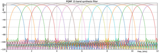 The use of a PQMF synthesis filter as an upsampling operator within a DNN was proposed in the Ref. [48] with a four-band PQMF. The same PQMF was later used in the Ref. [21] for the multi-band MelGAN. The general argument is that the PQMF synthesis filter allows generating channels with considerably reduced redundancy, leading to a reduction in computational complexity. As will be shown in the experimental evaluation in Section 3.2.3, the PQMF approach indeed leads to a slightly lower reconstruction error. In our setup, we need a 15-band PQMF synthesis filter that we have designed using the procedure described in the Ref. [49] using the Kaiser window with shape parameter . This allows achieving a stopband attenuation of approximately 90 dB. We selected a filter with 120 coefficients and pass-band transition starting at . The filter transfer function is displayed in Figure 2. The limitation to 120 coefficients does not allow a very steep transition, but the stopband suppression with 90 dB effectively suppresses any cross-talk over more than two neighboring bands.
