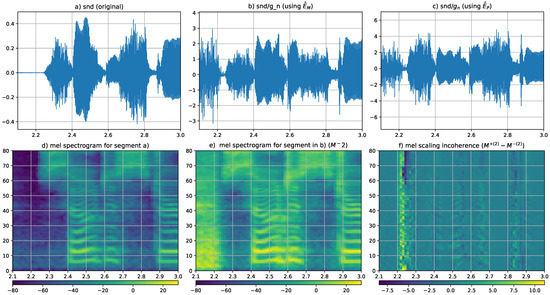 Adaptive normalization applied to a short segment of a speech signal. (a) Short segment of original speech signal. (b) Signal after normalization using with obtained from Equation (17) (note the change in vertical axis limits). (c) The same as in (b) but using energy estimation from Equation (16). (d) Mel spectrogram of original sound for the segment displayed in (a). (e) Mel spectrogram of sound segment in (b). (f) Visualization of the incoherence as the difference between the mel spectrogram from (e) and the mel spectrogram obtained by means of shifting mel frames in (d).