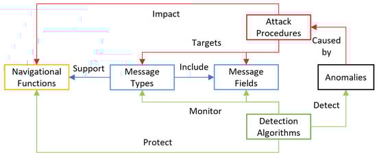 This paper focuses on the detection of anomalies in NMEA messages that can be caused by malicious actors. Figure 1 depicts the proposed meta-model of the NMEA anomaly detection system. Several NMEA message types support several navigational functions. Each message consists of several fields, each holding specific information. Attackers conduct attack procedures to impact navigational functions by targeting message types or fields. Defenders implement detection algorithms to protect the navigational functions by monitoring message types and fields to detect attack procedures. The meta-model is general in nature; as such, it is relevant to any use case that utilizes sensor data communicated in NMEA massages for navigational functions.