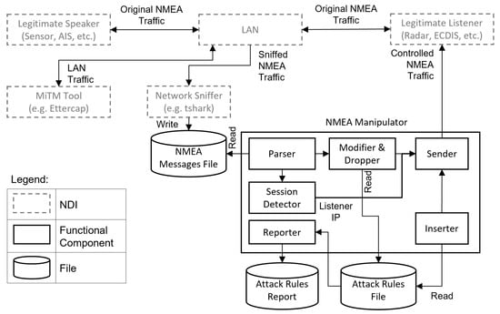 Not only autonomous ships but also conventional vessels sailing at sea today could be exposed to cyber attacks. Svilicic et al. [] unveiled the cyber vulnerabilities of an INS onboard ship. The authors acquired a total of 27 pieces of information, and four vulnerabilities using a vulnerability scanner. One of the detected vulnerabilities in the INS was reported as “Critical”. Moreover, a survey of intrusion detection in vehicles, including maritime vessels, is presented by Loukas et al. []. The authors discussed several works targeting Global Positioning System (GPS) and AIS spoofing and manipulation. However, no reference is made to the NMEA protocol.