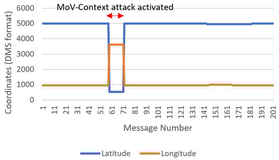 The National Marine Electronics Association (NMEA) defined a group of electronic and data specifications for the communication between different marine electronic systems. These specifications have manifested into a series of standards. The latest versions are NMEA0183 [] and NMEA2000 []. These standards govern the structure and the manner in which messages are communicated among the different devices. NMEA messages are mainly utilized in the maritime domain. However, the positioning information provided by them has found their application in other domains such as those with requirements for location tracking for personal security [,], and car theft detection []. While these messages provide an abundance of information utilized in different navigational tasks and functions, their security has been investigated and found to be lacking any controls such as authentication, encryption, and validation []. This makes them susceptible to a wide range of cyber-attacks.
