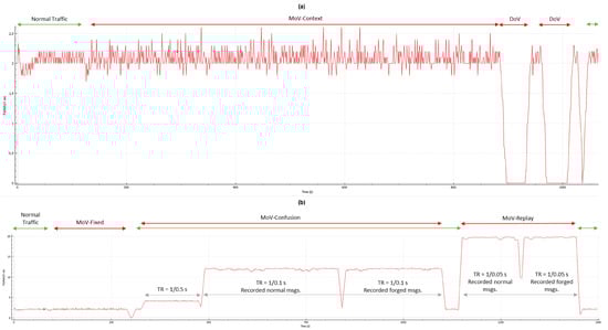 In this section, we discuss the activities performed during the fifth step in the analysis concerning attack techniques that are expected to invoke one or several of the anomalies identified during step 4. In this direction, we propose the application of the framework [] for threat modeling due to its comprehensive nature and suitable level of abstraction []. However, other threat modeling methods can still be applied if they propose attack techniques that can be technically achieved. The threat modeling approach considers both simple attacks as well as sophisticated attacks. Lokman et al. [] discussed several attack types against the CAN bus, namely, packet insertion, erasure, reply, and payload modification. In the framework, insertion, reply, and payload modification may fall under the Manipulation of View (MoV) attack technique [] while packet erasure may fall under Denial of View (DoV) attack technique []. A brief description of each technique is provided below: