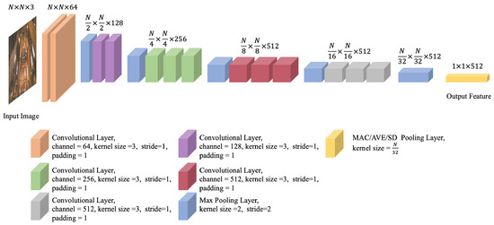 The CNN model adopted in this work for feature extraction is VGG16 [30]. It takes an input image of maximum size 1024 × 1024 and produces 512 feature maps of maximum size 32 × 32 from its very last pooling layer. A single feature element is extracted from each feature map via pooling. A 512-dimensional vector, which resulted from the concatenation of these elements, is converted, through centralization and normalization (here centralization is performed by subtracting the mean (computed based on the training set) while normalization yields a unit-length vector), to a global feature vector, which serves as a compact representation of the image.